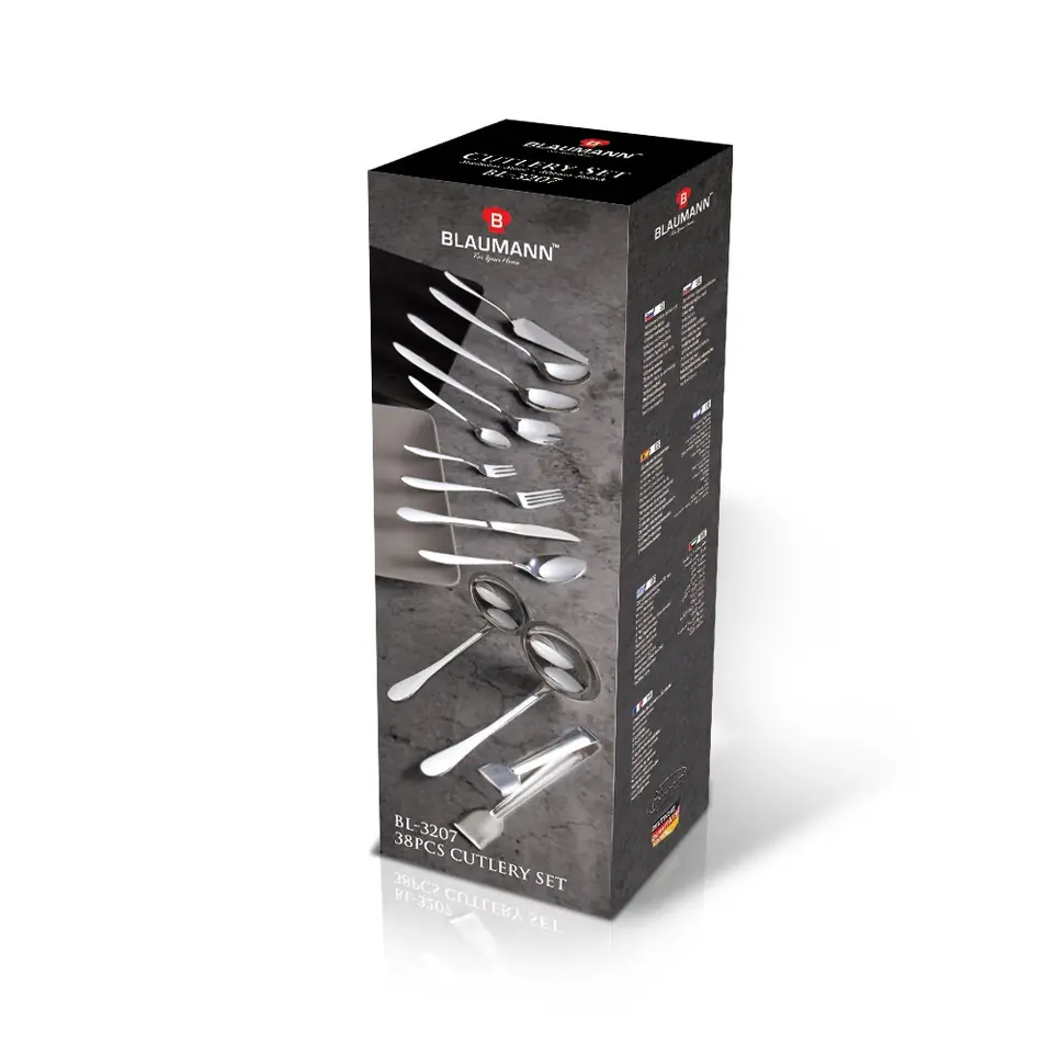 38 elementowy zestaw sztućców firmy BLAUMANN wykonanych ze stali nierdzewnej polerowanej na wysoki połysk