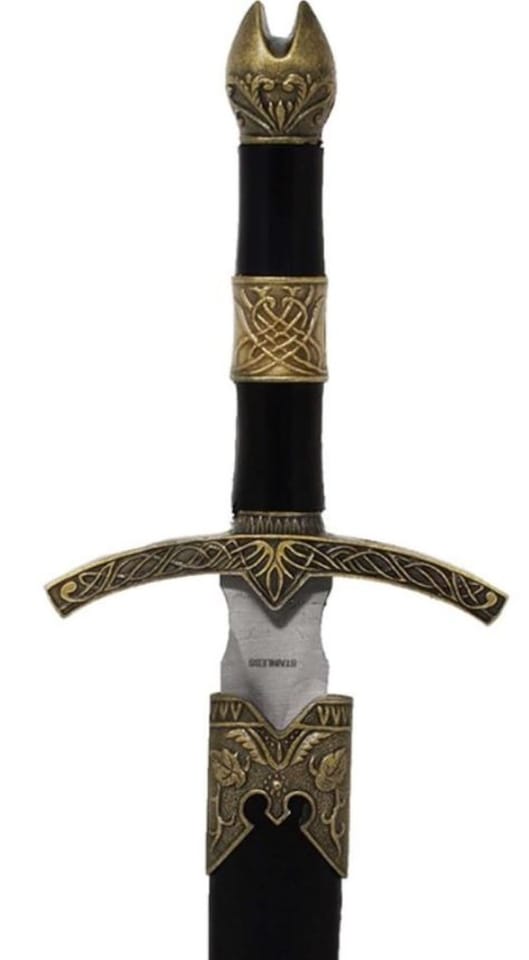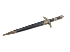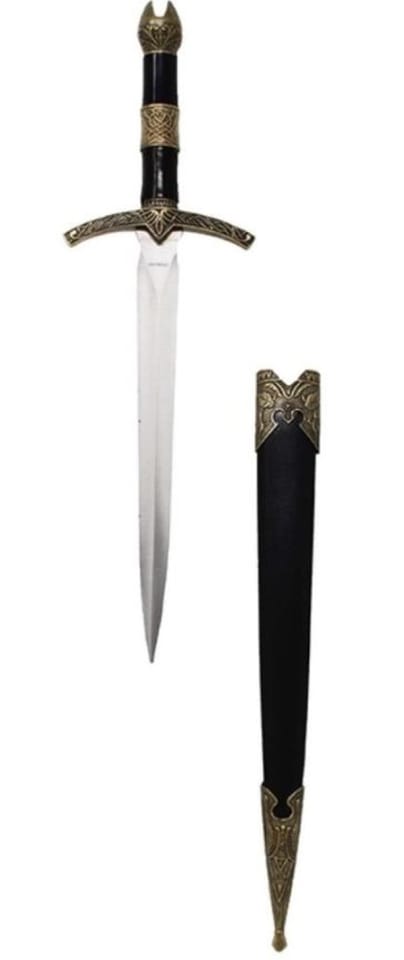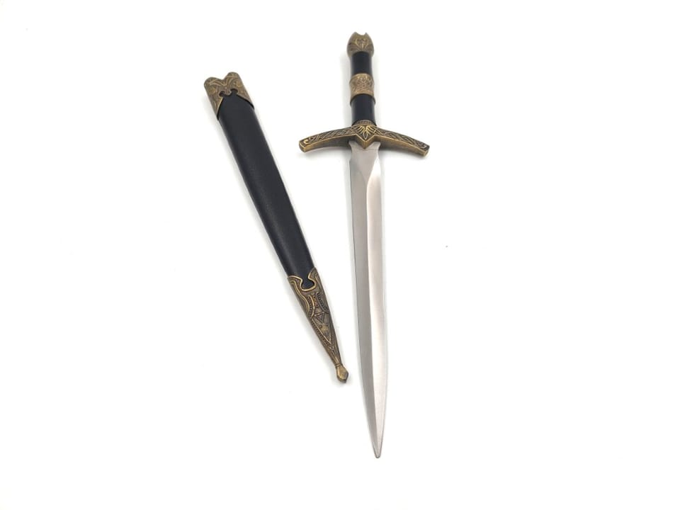 Stalowy sztylet rycerski - replika SW-178 Replika średniowiecznego sztyletu rycerskiego w pochwie - przedmiot dekoracyjny. Ten sztylet rycerski to dekoracyjna replika średniowiecznej broni, która przeniesie Cię w czasy rycerzy i zamków. Wykonany z dbałością o detale, będzie ozdobą, która zachwyci każdego miłośnika historii i militariów. Informacje o produkcie: ·Długość - 34cm ·Waga - 0,23kg ·Wykonany ze stali nierdzewnej ·Ozdobna pochwa w komplecie ·Estetyczne pudełko prezentowe ·To nie jest broń - sztylet ma stępione ostrze Dlaczego to idealny wybór? ·Wysoka jakość i design: Sztylet wykonano ze stali nierdzewnej, co gwarantuje trwałość i elegancki wygląd. Do zestawu dołączono ozdobną pochwę, która podkreśla jego unikalny charakter. ·Gotowy prezent: Produkt jest dostarczany w eleganckim pudełku prezentowym, więc jest od razu gotowy do wręczenia. To idealny upominek dla kolekcjonera, pasjonata historii, fana średniowiecza lub każdego mężczyzny, który ceni sobie stylowe dodatki do gabinetu. Uwaga! Sztylet nie jest zabawką. Ma charakter dekoracyjny. Należy chronić przed dziećmi. Nie należy powierzać osobom poniżej 18 roku życia!