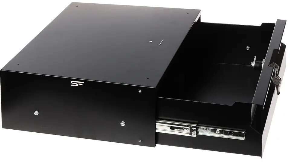 Szuflada do szafy RACK 19", zabezpieczona zamkiem na kluczPółka RD19-3U-320B może służyć do przechowywania dokumentów lub drobnych narzędzi wewnątrz szafy RACKZainstalowany zamek skutecznie zabezpiecza zawartość szuflady przed dostępem osób niepożądanych