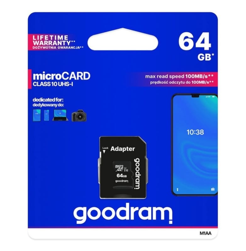 Karta micro SD XC 64GB GoodRam z AdapteremZaprojektowana z myślą o nowoczesnych urządzeniach, karta pamięci marki Goodram z interfejsem UHS-I to idealne rozwiązanie dla osób poszukujących szybkich i niezawodnych nośników danych. Idealna do urządzeń takich jak: smartfony, tablety, kamery sportowe inne gadżety wyposażone w slot microSD. ➡️ Karta micro SD GoodRam oferuje wszystko co potrzebne, aby robić doskonałe zdjęcia i nagrywać filmy w wysokiej jakości jakości.⭐ Szybkość i Niezawodność Dzięki klasie prędkości Class 10 karty te znakomicie sprawdzają się przy nagrywaniu filmów w Full HD (1080p) oraz robieniu zdjęć w wysokiej rozdzielczości, a rewelacyjna prędkość transferu plików (do 100 MB/s) ułatwia zgrywanie materiałów w celu dalszej obróbki lub udostępniania.⭐Trwałość i Bezpieczeństwo Karty pamięci Goodram to nie tylko wydajność, ale i niezawodność w trudnych warunkach. Charakteryzują się odpornością na wodę, wstrząsy, promieniowanie RTG oraz pole magnetyczne. Dzięki starannie wyselekcjonowanym komponentom, karta przetrwa najcięższe warunki pracy.⭐ Adapter SD Dzięki dołączonemu adapterowi, możesz bez przeszkód wykorzystać kartę w aparatach fotograficznych, komputerach PC oraz laptopach z gniazdem kart SD. To sprawia, że nośnik danych jest niezwykle uniwersalnym rozwiązaniem w codziennym użytkowaniu.⭐ Dane techniczne: Pojemność: 64GB Format: microSD XC Klasa prędkości: CLASS 10 Prędkość odczytu: do 100 MB/S Prędkość zapisu: do 10 MB/S Interfejs: UHS-I Prędkość interfejsu: U1 System plików: FAT32, exFAT Temperatura pracy: 0°C – 70°C (zalecana) Temperatura przechowywania: -25°C – 85°C (zalecana) Wymiary karty: 15 x 11 x 1 mm