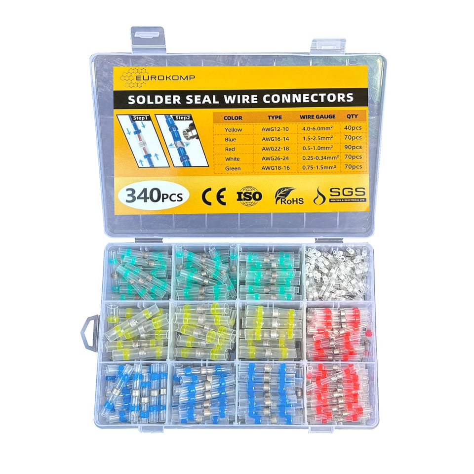 Złączki do kabli wykonane są z cyny lutowniczej, koszulki termokurczliwej oraz termoplastycznego kleju.? Za trwałe połączenie żył odpowiada cyna, która roztapiając się łączy i zapewnia pewny styk żył.? Klej termoplastyczny zapewnia szczelność i izolację połączenia.? Całość połączenia w tego rodzaju złączce kablowej dokonuje się w tym samym czasie, przezroczysta rurka termokurczliwa umożliwia stałą kontrolę podczas procesu łączenia żył.? Zawartość zestawu 340 szt:? Szybkozłączki z cyną biało - transparentne zakres przewodów 0,25~0,35mm2 (70 sztuk)? Szybkozłączki z cyną czerwono - transparentne zakres przewodów 0,5~1,5mm2 (90 sztuk)? Szybkozłączki z cyną zielono - transparentne zakres przewodów 0,75~1,5mm2 (70 sztuk)? Szybkozłączki z cyną niebiesko - transparentne zakres przewodów 1,5~2,5mm2 (70 sztuk)? Szybkozłączki z cyną żółto - transparentne zakres przewodów 4~6mm2 (40 sztuk)? WODOODPORNEZłącza zapobiegają korozji przewodów i chronią przed uszkodzeniem.? DOSKONAŁE TOPIENIEWysokiej jakości dwuścienne rurki polietylenowe i klejem topliwym wewnątrz zapewniają doskonałe uszczelnienie i chronią złącza elektryczne. Współczynnik skurczu 2:1? WIELOFUNKCYJNYMoże być używany w samochodach łódkach, motocyklach ITP.? WIZUALANA KONTROLAPodczas lutowania mamy cały czas kontrole nad jakością i przebiegiem procesu? BEZ ZACISKANIAKoszulki nie potrzebują specjalistycznych narzędzi wystarczy każde źródło ciepła powyżej 135 Stopni? Dane techniczne: Temperatura robocza -55°C ~ 125°C Temperatura kurczenia i topienia cyny powyżej 150°C Stopień skurczu 2:1 Materiał izolujący Poliolefin Maksymalne napięcie 600V Stopień kurczenia 2:1 Opakowanie plastikowe z zamknięciem