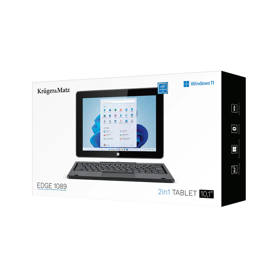 ---------------System i główne parametry---------------System operacyjny: Windows 11 ProCPU: Intel® Celeron® procesor N4020, Dual CoreGPU: Intel® UHD Graphics 600Częstotliwość CPU: 1,1 GHz (maks. 2,8 GHz)RAM: 4 GB DDR3Pamięć wewnętrzna: 128 GB---------------Ekran---------------Panel dotykowy: pojemnościowy, wielopunktowyPrzekątna: 10,1”Rozdzielczość: 1280 x 800 pxProporcja: 16:9Matryca: IPS---------------Multimedia---------------Tylny aparat: 2 MpxPrzedni aparat: 2 MpxGłośniki: 2x 1 WMikrofonG-sensorCzujnik Halla---------------Łączność---------------Wi-Fi: 802.11 b/g/n/ac (2,4 GHz / 5 GHz)Bluetooth: 4.2---------------Porty---------------Czytnik kart microSD (maks. 128 GB)USB typu C (przesyłanie danych)Wyjście mini HDMIWyjście słuchawkoweUSB 3.0USB 2.0 (na klawiaturze)Port ładowania---------------Zasilanie---------------Ładowarka: 12 V, 2 APojemność baterii: 3000 mAh (7,4 V)---------------Cechy fizyczne---------------Wymiary tabletu: 258 x 173 x 10 mmWymiary tabletu z klawiaturą: 258 x 182 x 22 mm Waga tabletu: 635 gWaga tabletu z klawiaturą: 1100 g---------------W zestawie---------------Klawiatura (tylko model KM1089)ŁadowarkaKabel USBInstrukcja obsługi