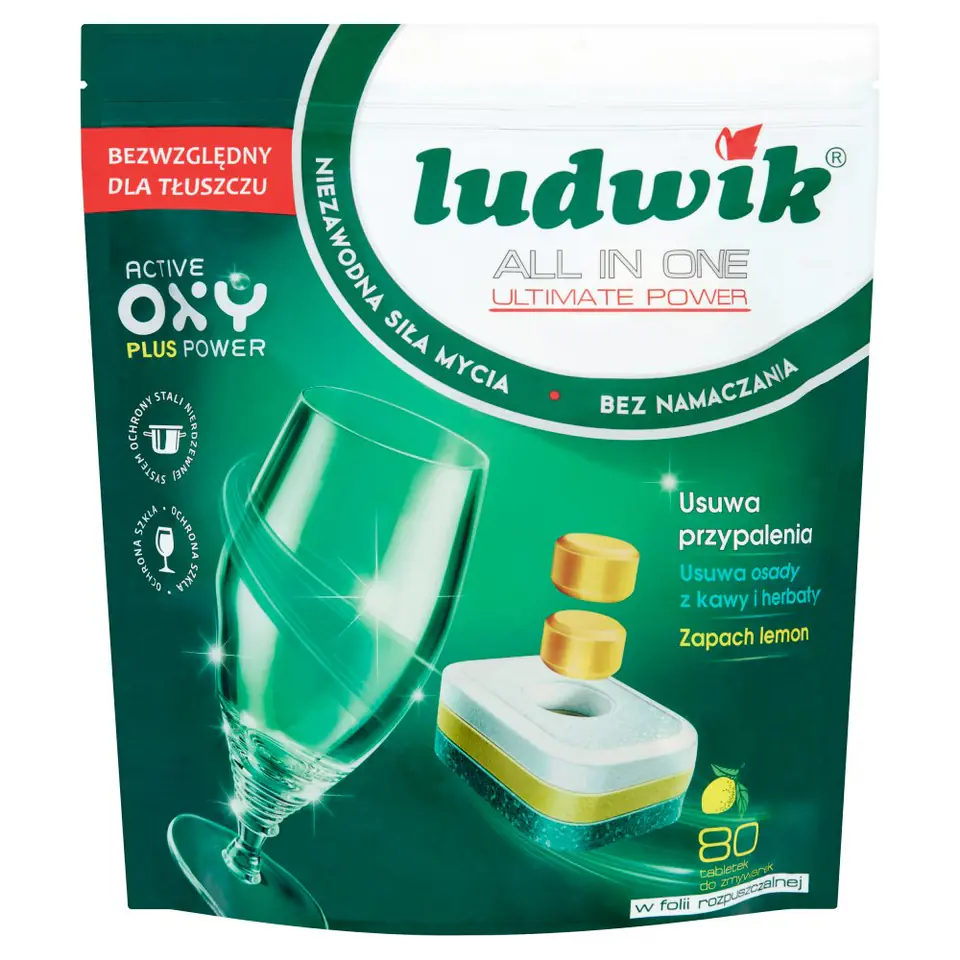 Ludwik All in One tabletki do zmywarek posiadają innowacyjną formułę Active Oxy Power Plus, która dzięki kompleksowemu działaniu środków alkalicznych, enzymów i aktywnego tlenu bezwzględnie walczy z tłuszczem i przypaleniami. Efektywnie usuwa nawet najbardziej uporczywe zabrudzenia bez konieczności namaczania, nadaje połysk. Zawarte w formule specjalne substancje zapobiegają matowieniu oraz korozji szkła i stali nierdzewnej.