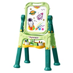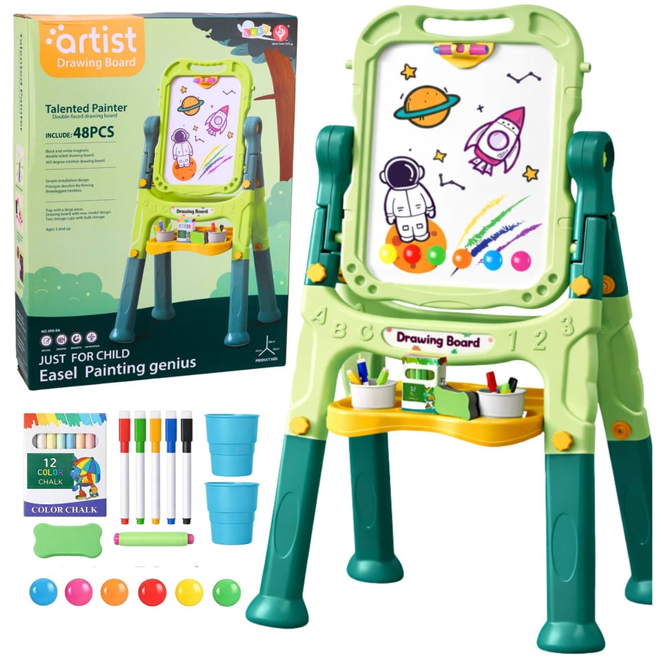 Bogaty zestaw akcesoriów pozwala dziecku od razu rozpocząć zabawę. W komplecie znajdują się kredy, pisaki suchościeralne, magnesy, gąbka do ścierania oraz praktyczny uchwyt do kredy, który chroni dłonie przed zabrudzeniem.