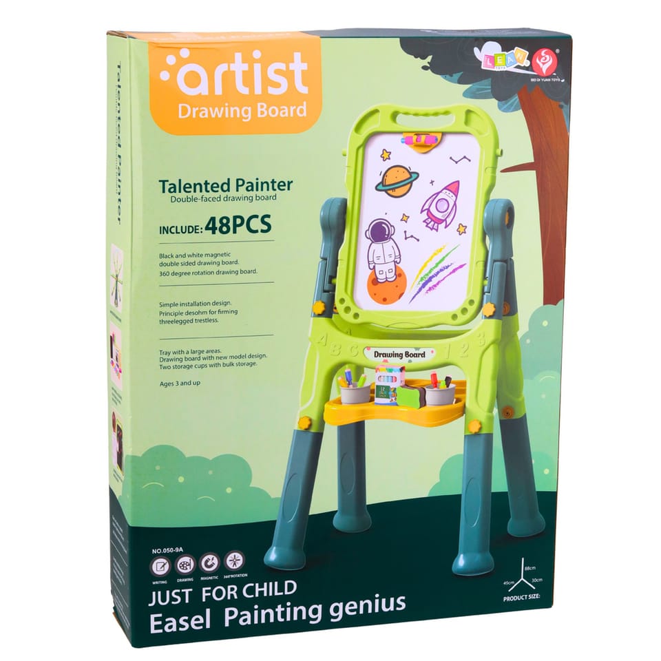 Tablica została wyposażona w stabilny stojak z półką na akcesoria, dzięki czemu wszystkie elementy zestawu mogą być zawsze pod ręką. Konstrukcja umożliwia obracanie tablicy o 360 stopni, co pozwala szybko zmieniać stronę do rysowania lub nauki.