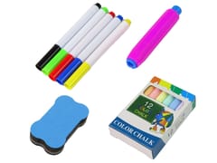 W zestawie znajdziesz pełen pakiet: samą tablicę z nóżkami, 5 różnokolorowych pisaków (niebieski, czerwony, żółty, zielony, czarny), praktyczną gąbkę do zmywania, a także 12 kolorowych kred (po 2 z każdego koloru) do pisania po czarnej stronie. Dodatkowo, osłonka na kredę umożliwia malowanie bez brudzenia rąk, a zestaw magnesów z literkami, cyferkami i znakami zapewnia dynamiczną i interaktywną naukę.