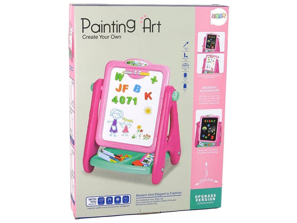 Wymiary tablicy to imponujące 41 cm x 27 cm x 37 cm, a funkcjonalne opakowanie ma wymiary 48 cm x 35 cm x 8 cm. Ta tablica nie tylko zapewni radość z kreatywnej zabawy, ale także wspomoże rozwijanie umiejętności pisania, rysowania, liczenia i nauki liter.