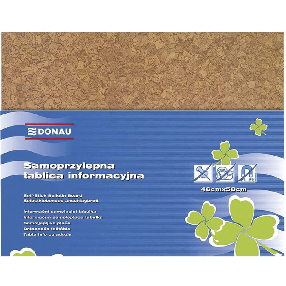 * tablica informacyjna o wzorze korkowym * samoprzylepna - umożliwia wielokrotne przyklejanie i odklejanie dokumentów bez * konieczności używania magnesów, pinezek, bądź taśmy samoprzylepnej * posiada paski samoprzylepne do samodzielnego montażu z tyłu tablicy, bez konieczności wiercenia, do przylepienia na ścianie, lodówce, szafce, itp. * pokryta folią zabezpieczającą samoprzylepną warstwę (do oderwania przed użyciem) * wymiary: 58x46x0,4cm * kolor brązowy