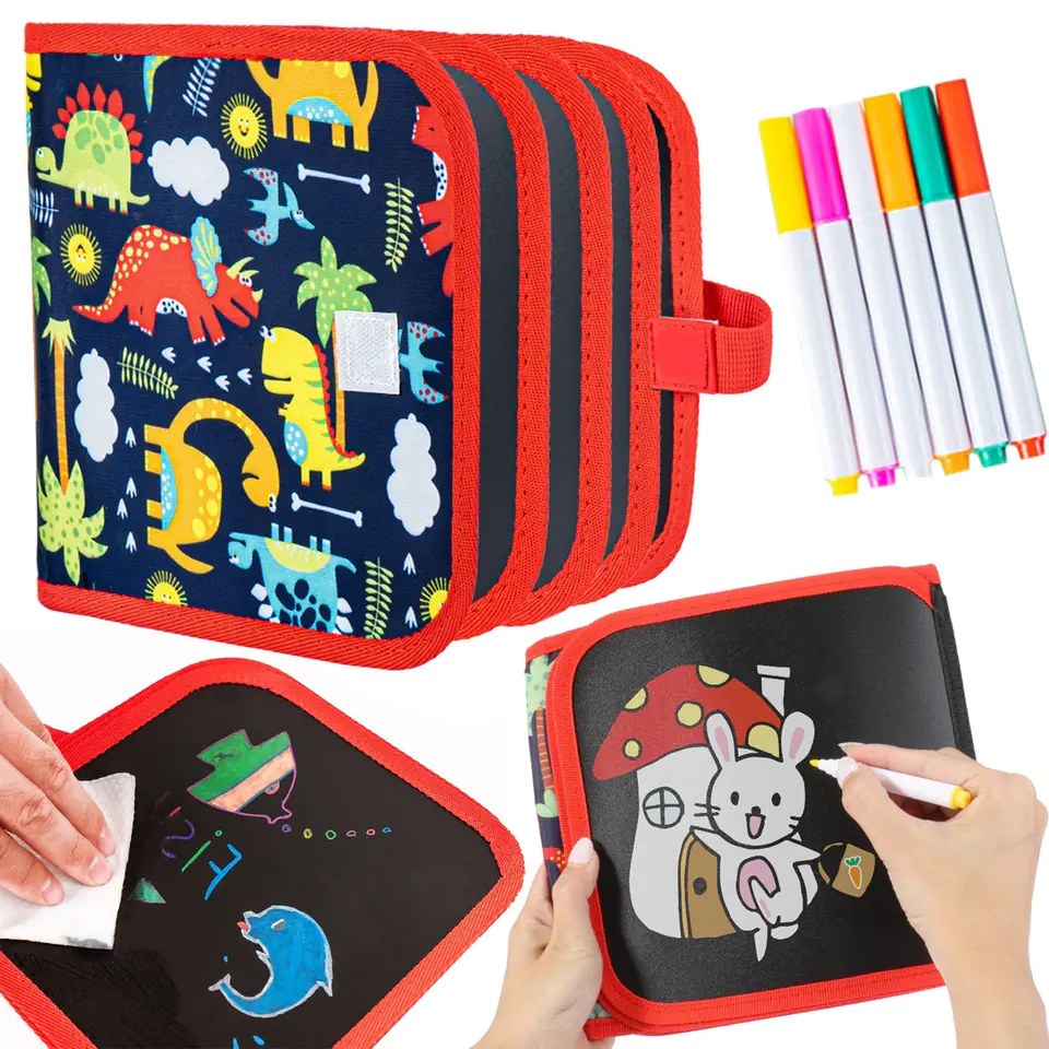 ❤️ Do zestawu dołączonych jest 6 markerów kredowych, które zmywają się przy pomocy mokrej szmatki. Książeczka wykonana jest z materiału wodoodpornego dzięki temu można ją w łatwy sposób wyczyścić.