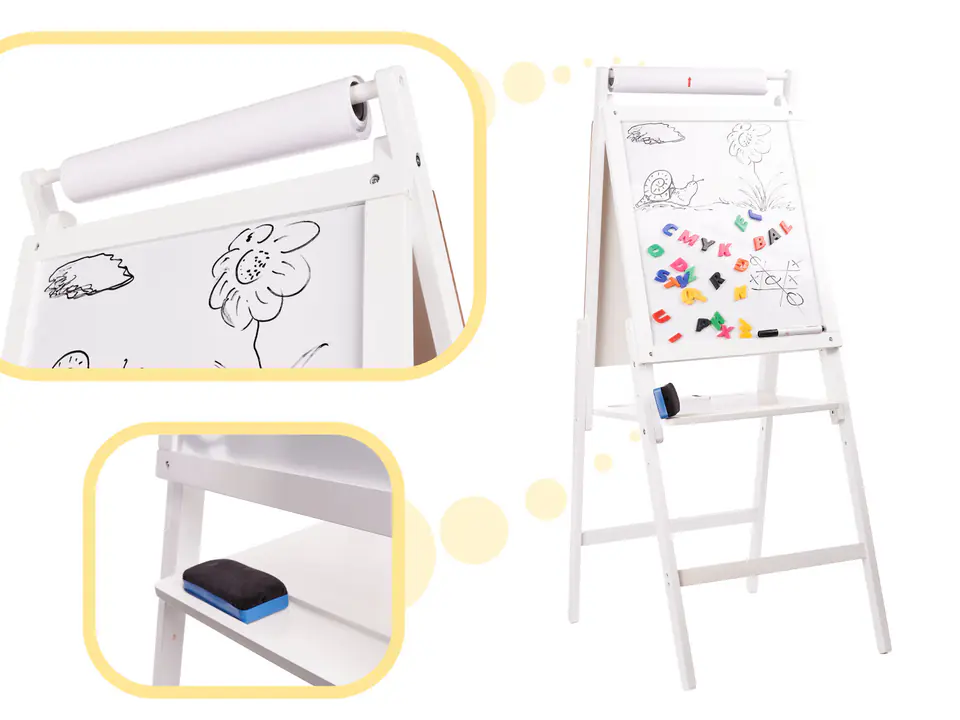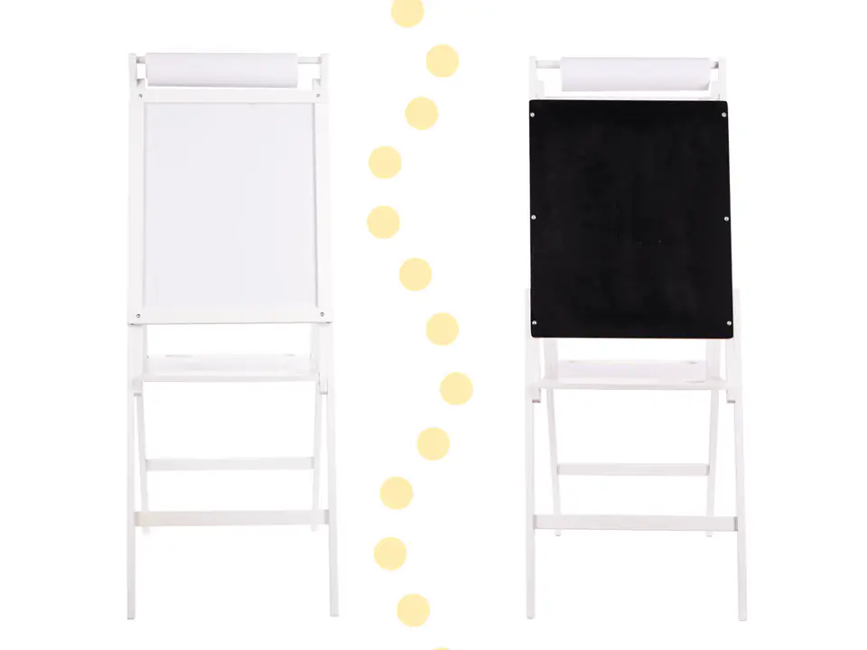 Biała strona tablicy przeznaczona jest do pisania lub rysowania mazakami, można również przyczepiać do niej magnesy. Po przewróceniu na drugą stronę pojawi się tablica kredowa.