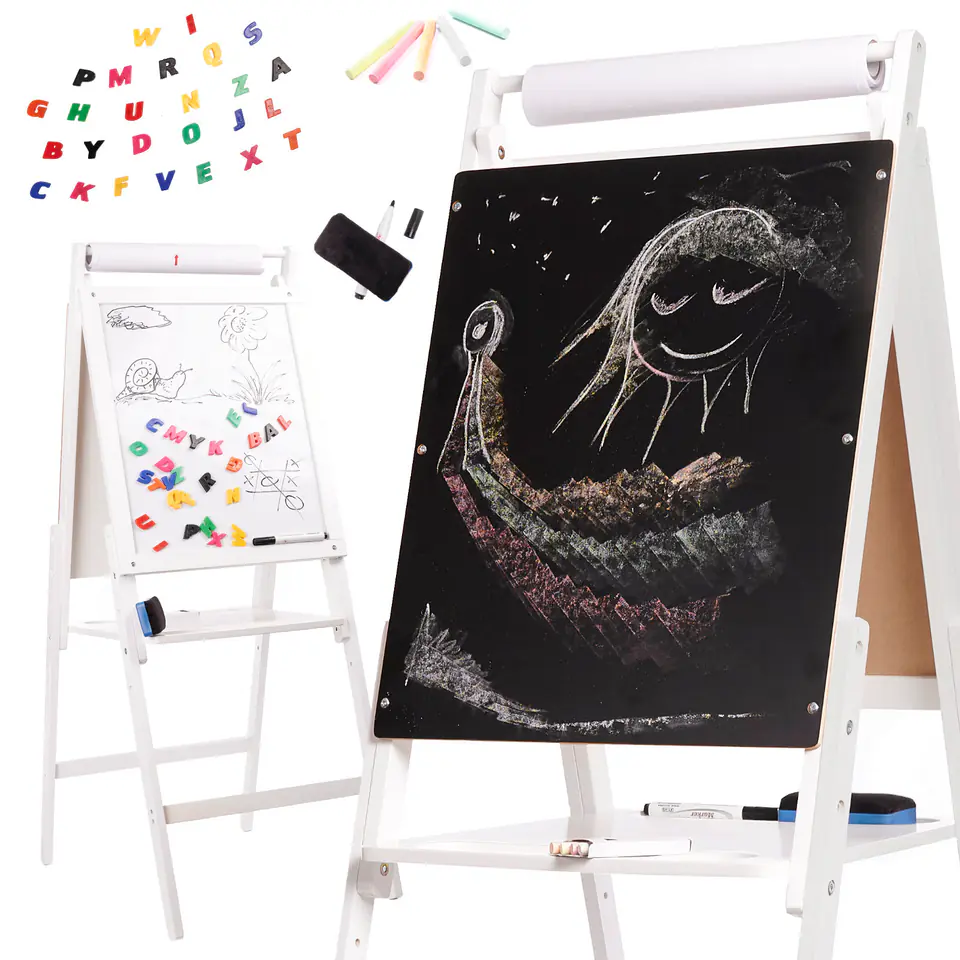 • Dwustronna tablica z akcesoriami - połączenie czarnej tablicy kredowej i białej tablicy w jednym, spójnym systemie, uzupełnionym o kredy, mazak, gąbkę oraz papier do twórczej nauki i zabawy