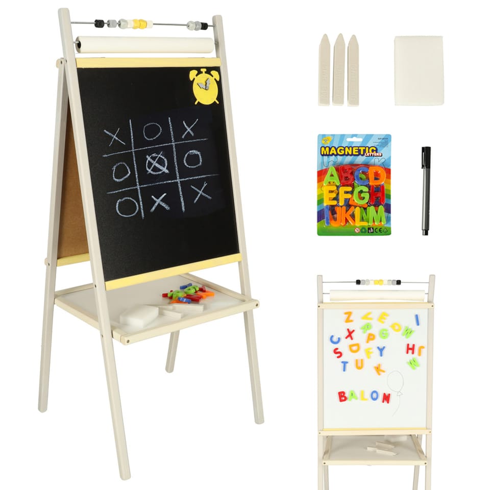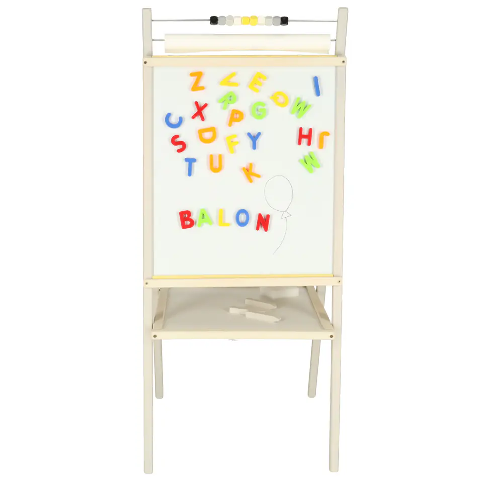 Jedna strona tablicy jest kredowa, idealna do rysowania i pisania kredą, a druga magnetyczna, umożliwiająca zabawę z magnesami w kształcie liter. Dodatkowo tablica wyposażona jest w liczydło, które pomaga dziecku zrozumieć podstawy matematyki, oraz rozwijaną rolkę papieru do malowania jak na zwykłych kartkach.