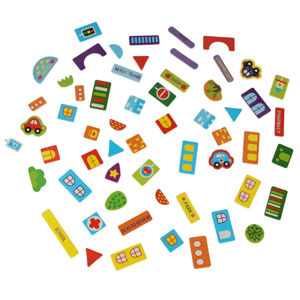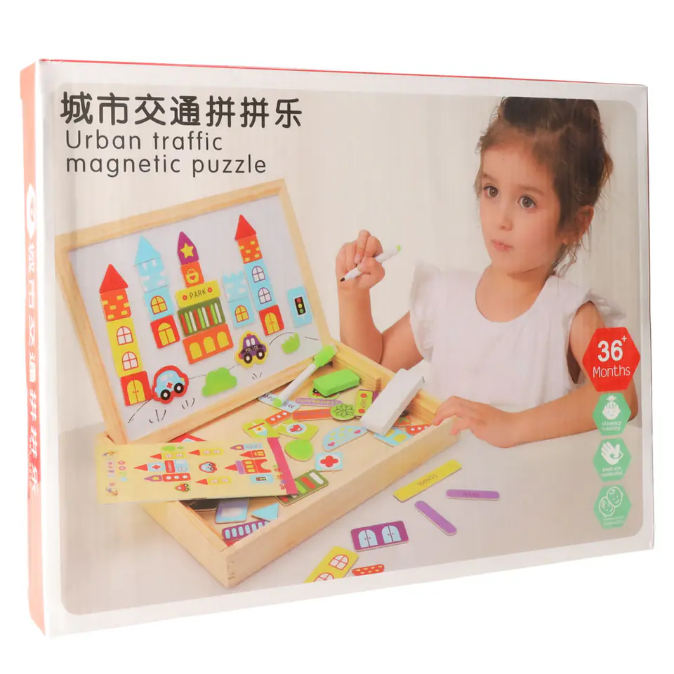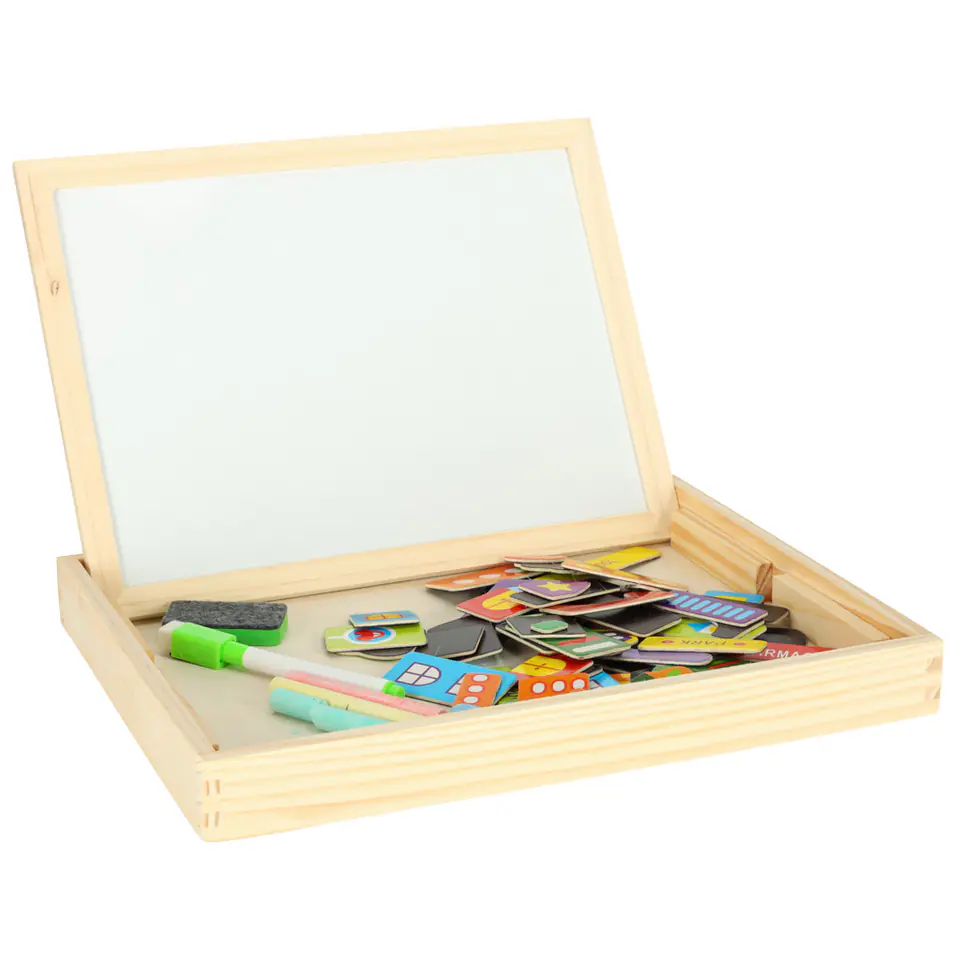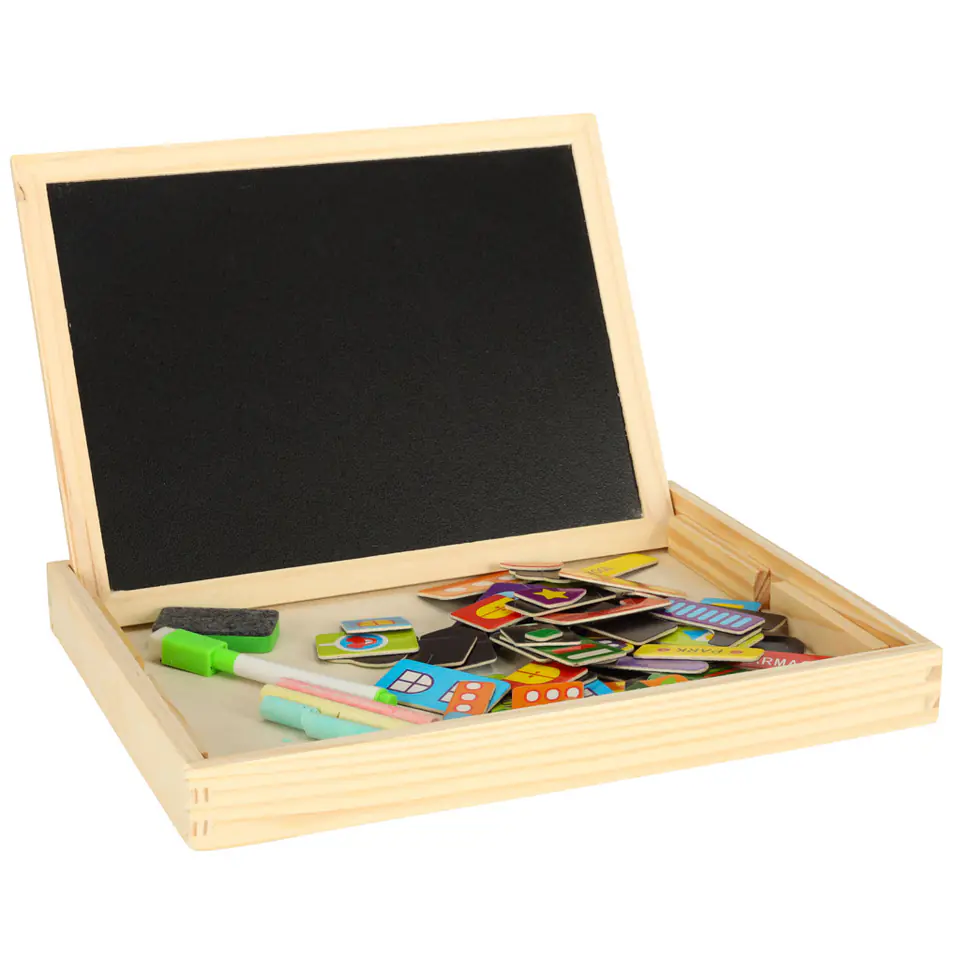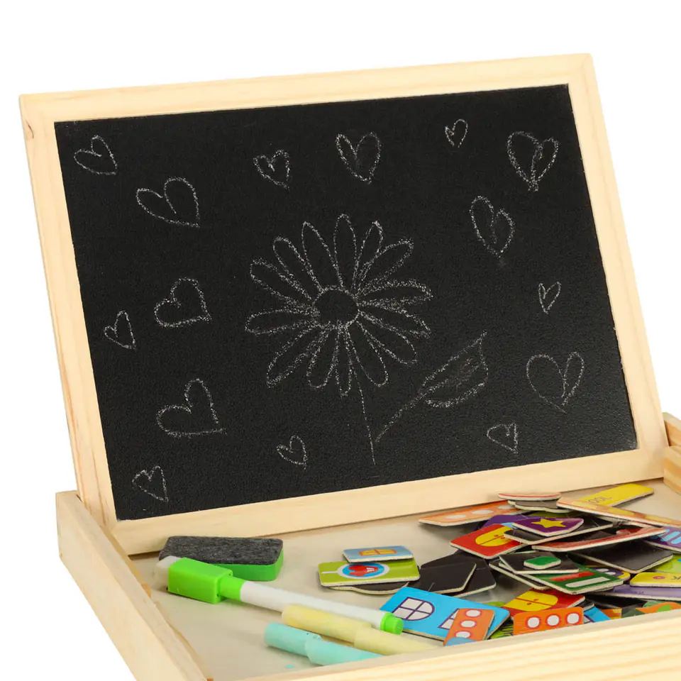 Drewniana tablica dwustronna z magnetycznymi puzzlami do układania obrazków.