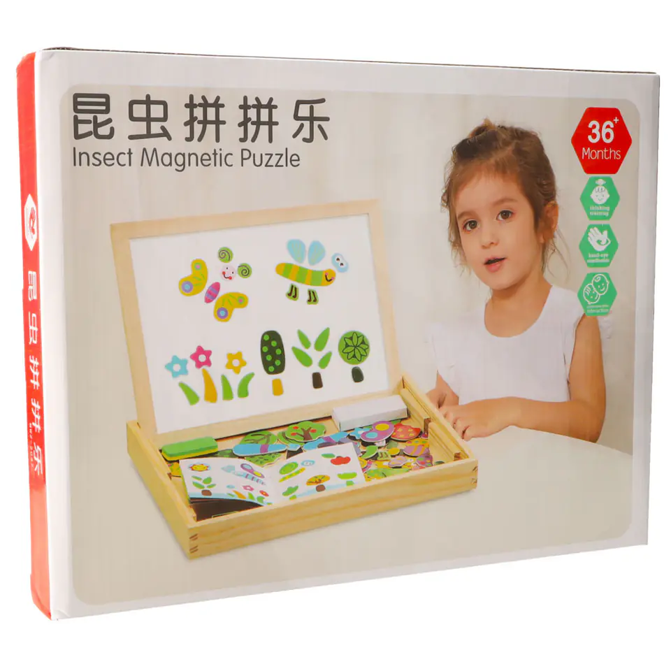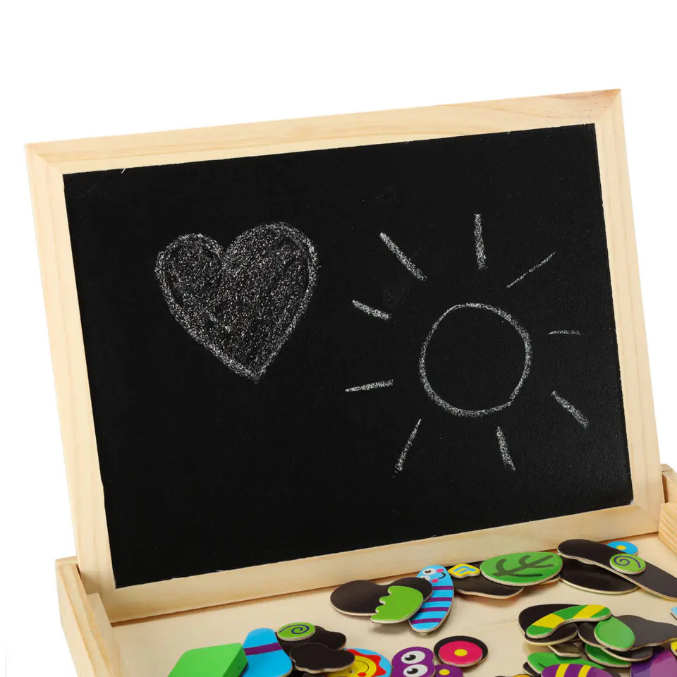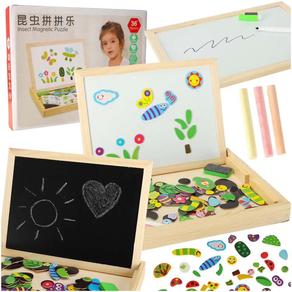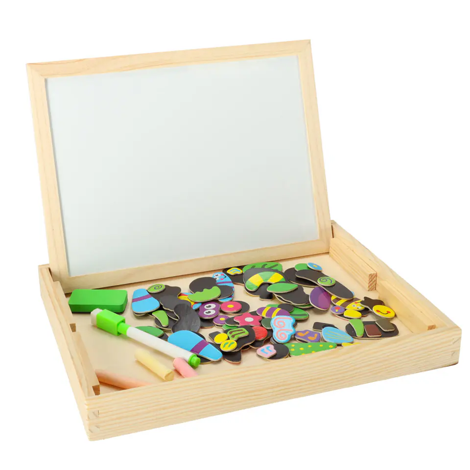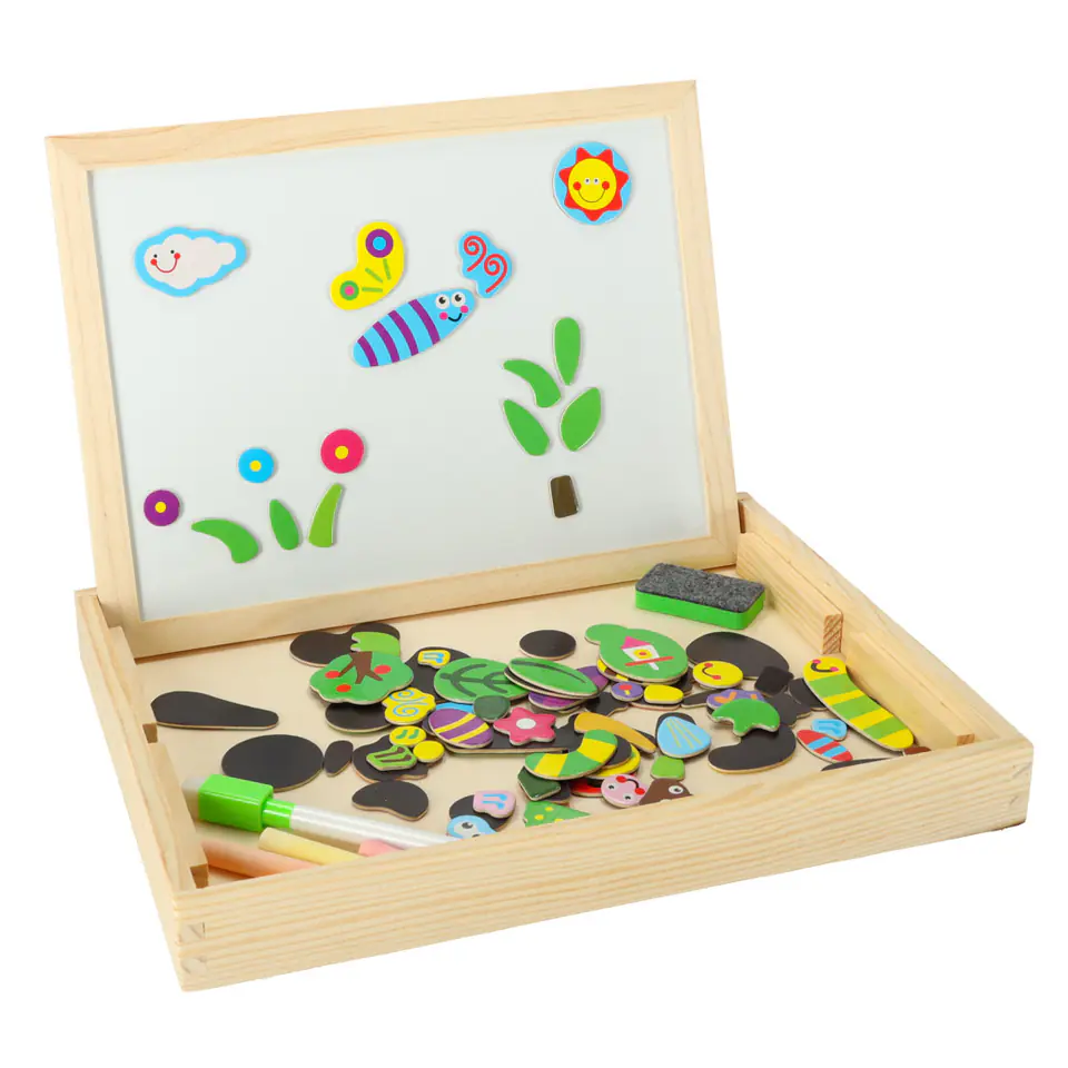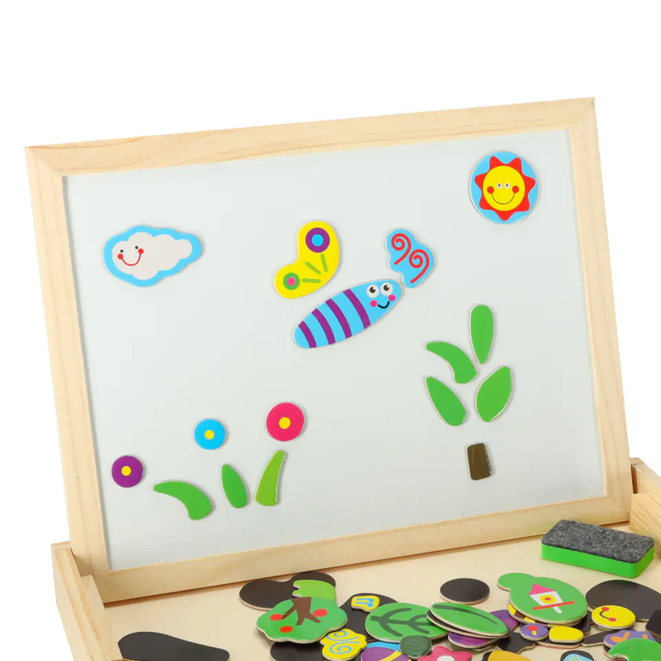 Drewniana tablica dwustronna z magnetycznymi puzzlami do układania obrazków.