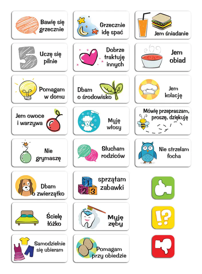 - pola z gotowymi obowiązkami, m.in.: myję zęby, sprzątam zabawki
