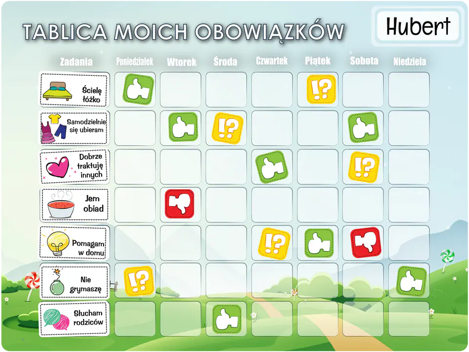 Jeden z najnowszych, najpopularniejszych oraz najefektywniejszych sposobów zachęcania dzieci do domowych obowiązków. Dzięki tej tablicy twoje dziecko nie tylko pokocha swoje obowiązki, ale również nauczy się w szybki i prosty sposób dyscypliny oraz odpowiedzialności.