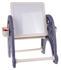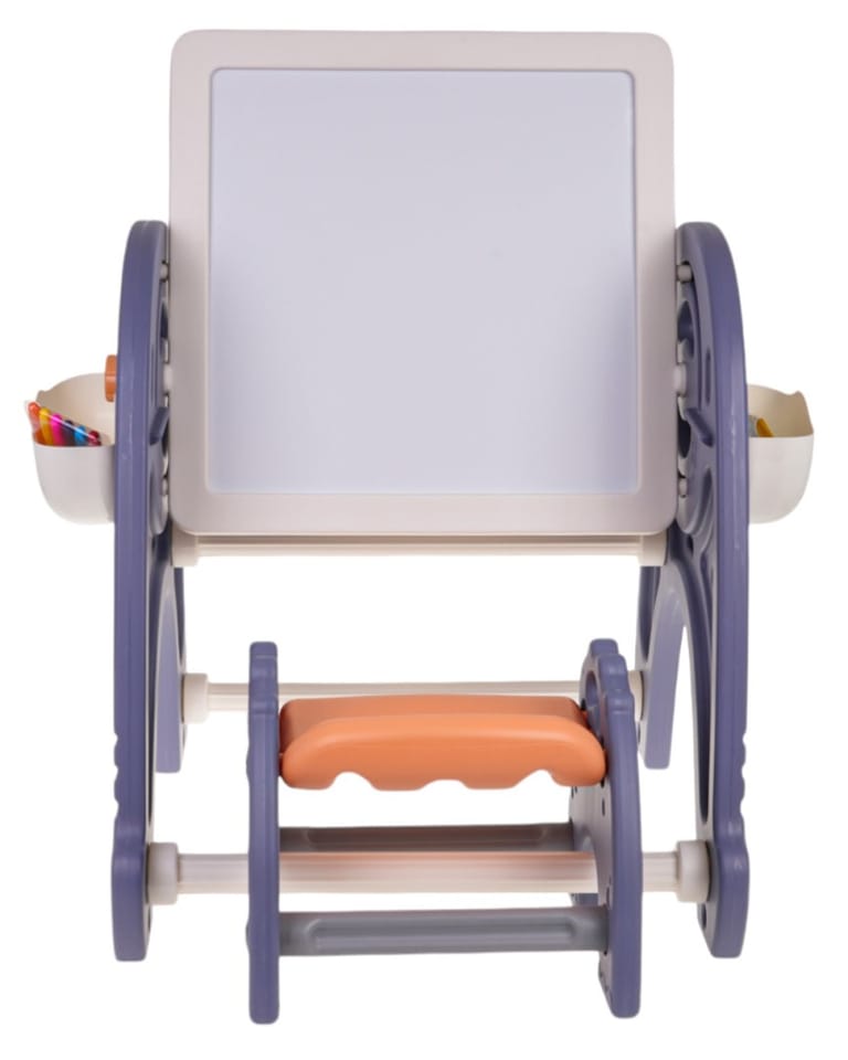 Zestaw 4 w 1, tablica, stolik, podkładka do układania klocków i krzesełko dla dzieci od 3-go roku życia. Zestaw wykonany został z najlepszej jakości plastiku, nie posiada ostrych krawędzi i jest stabilny. Na plastikowych nóżkach umieszczona jest tablica, którą można pochylać pod dowolnym kątem i obracać. Z jednej strony mamy tablicę do malowania a z drugiej podkładkę do układania klocków. Z tablicy i podkładki możemy korzystać w pozycji pionowej lub poziomej. W pozycji poziomej możemy korzystać z zestawu jak ze stolika do malowania, nauki czy jedzenia lub podstawki na klocki. Do zestawu dołączono gąbkę oraz 6 mazaków. Po bokach zestawu znajdują się również dwa kosze na przybory do malowania. Zestaw rozwija wyobraźnie i umiejętności poznawcze dzieci. Funkcje zestawu: - przeznaczony dla dzieci od 3-go roku życia, - wykonany z bezpiecznych materiałów, nie posiada ostrych krawędzi, - wiele możliwości zabawy: * stolik do malowania, * stolik do nauki lub zabawy, * podstawka do układania klocków, * tablica do malowania, - stabilne krzesełko, - rozwija wyobraźnię i umiejętności poznawcze dzieci.