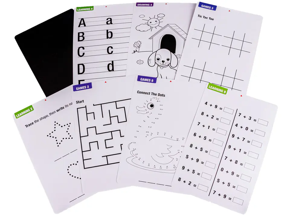 Do zestawu dołączone są również szablony, które można wsunąć za główną matrycę. Dziecko może "pokolorować" szablony lub śledzić linie, rozwijając przy tym swoje zdolności manualne.
