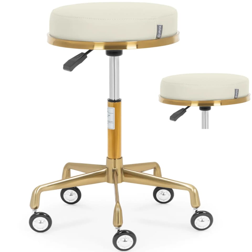 Kod producenta: 10040856Wszechstronny i wygodny taboret kosmetyczny marki physa zapewni wygodę podczas pracy w salonie fryzjerskim lub kosmetycznym, czy nawet gabinecie lekarskim. Stołek charakteryzuje się wysoką jakością i szczególną trwałością, a także zachwyca wieloma praktycznymi detalami. Wygodne siedzisko o średnicy 35 cm ma regulowaną wysokość. Na siedzisku znajduje się intuicyjny uchwyt, którym szybko i łatwo określa się wysokość za pomocą ciśnienia gazu. Pianka zastosowana jako wypełnienie jest miękka i stabilna, dzięki czemu można wygodnie siedzieć na taborecie nawet przez dłuższy czas. Obicie jest starannie naciągnięte na podstawę wykonaną z wysokiej jakości sklejki, zapewniając siedzisku niezbędną stabilność. Taboret kosmetyczny oferuje maksymalną swobodę ruchów dzięki płynnie obracającym się kółkom. Poruszają się one cicho i dobrze skręcają na podłodze. Siedzisko można obrócić o 360deg; i zapewnić mobilność podczas wszystkich czynności bez ograniczeń. Obicie siedziska z PVC jest odporne na kurz i wodę, co oznacza, że mniej się zabrudzi podczas pracy. Zastosowane materiały można wyczyścisz z łatwością. Pomimo kompaktowej, stylowej konstrukcji, stołek jest bardzo stabilny i z łatwością zniesie obciążenie do 150 kg. Beżowe siedzisko i złota rama nadają taboretowi na kółkach nowoczesną elegancję, która idealnie wpasuje się w każdy wystrój.Cechy produktu: