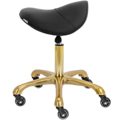 Kod producenta: 10040828Krzesło siodłowe marki physa pozwoli automatycznie przyjąć zdrową pozycję siedzącą i odciążyć kręgosłup podczas pracy. Dodatkowo nowoczesny design w kolorze czarnym ze złotymi akcentami będzie dobrze prezentował się w każdym salonie czy biurze. Krzesło posiada ergonomiczne siedzisko o wymiarach 41 x 37 cm i płynnie działające kółka. Dzięki nim z łatwością można przepchnąć lub przeciągnąć stołek roboczy w wybrane miejsce. Taboret siodłowy do biura, gabinetu lub salonu udźwignie do 150 kg. Wysokość płynnie ustawia się w zakresie od 57 do 75 cm dzięki sprężynie gazowej. Piankowe wypełnienie zapewni miękką powierzchnię do siedzenia. Siedzisko pokryte jest sztuczną skórą, którą łatwo wyczyścić.Cechy produktu:
