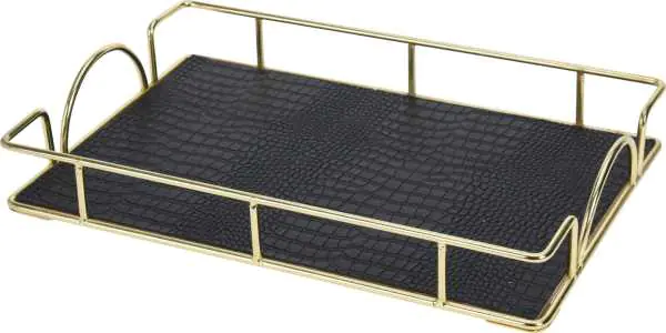 Prostokątna taca do serwowania 30x20x4 cm Plastikowa taca z metalowym rantem w modnych kolorach - złotym i czarnym. Modny dodatek do Twojego salonu, kuchni. Oprócz serwowania potraw możesz eksponować na niej owoce, alkohole itp. Specyfikacja: wymiary: 30 x 20 x 4 cm, materiał: metal, plastik, faktura tacy imituje skórę, waga: 780 g, kolor: czarny, złoty.