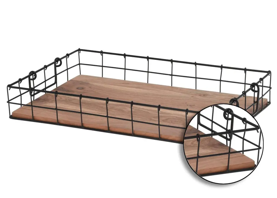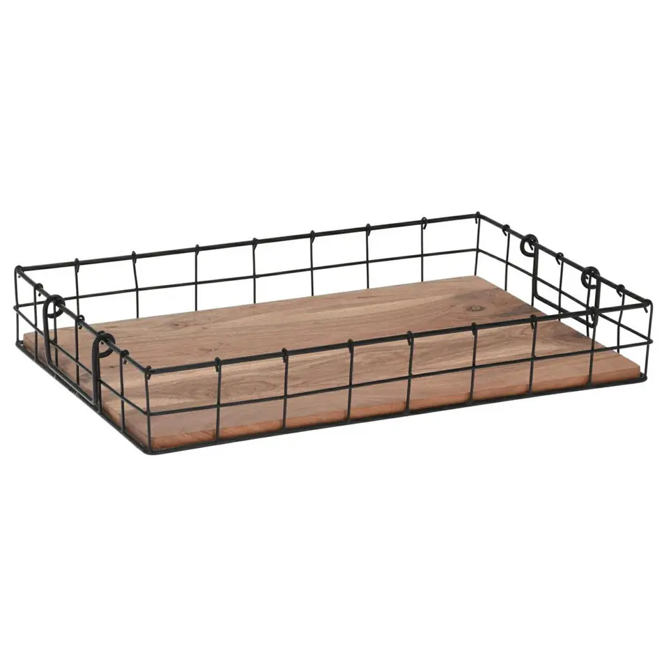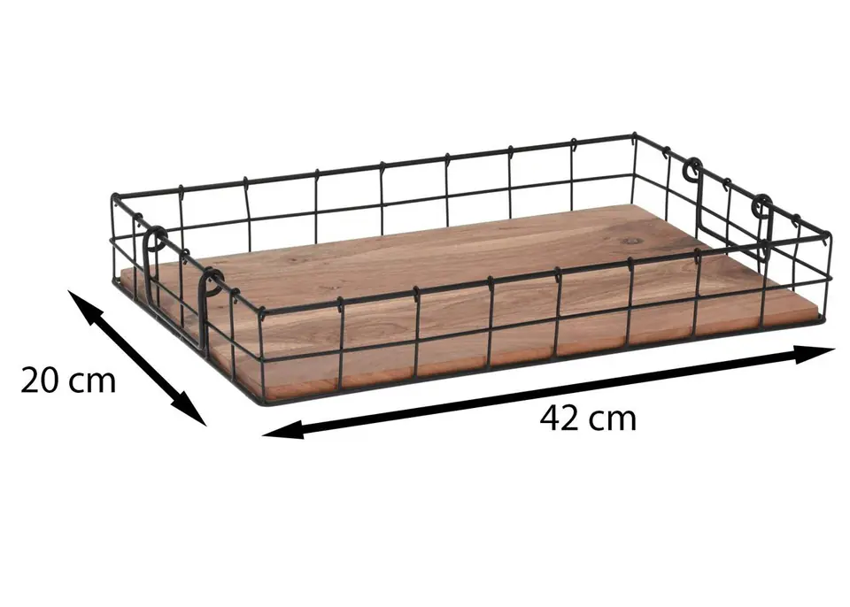 Prostokątna taca z drewnianym spodem i metalową obwódką. Ciekawe, loftowe wzornictwo w połączeniu z naturalną kolorystyką drewna nadaje tacy charakteru i sprawia, że będzie wyróżniającą się ozdobą stołu. Taca między innymi posłuży do serwowania kawy czy herbaty lub może pełnić rolę podstawki pod świece. Posiada dodatkowo poręczne uchwyty, które umożliwią wygodne przenoszenie tacy wraz z zawartością.