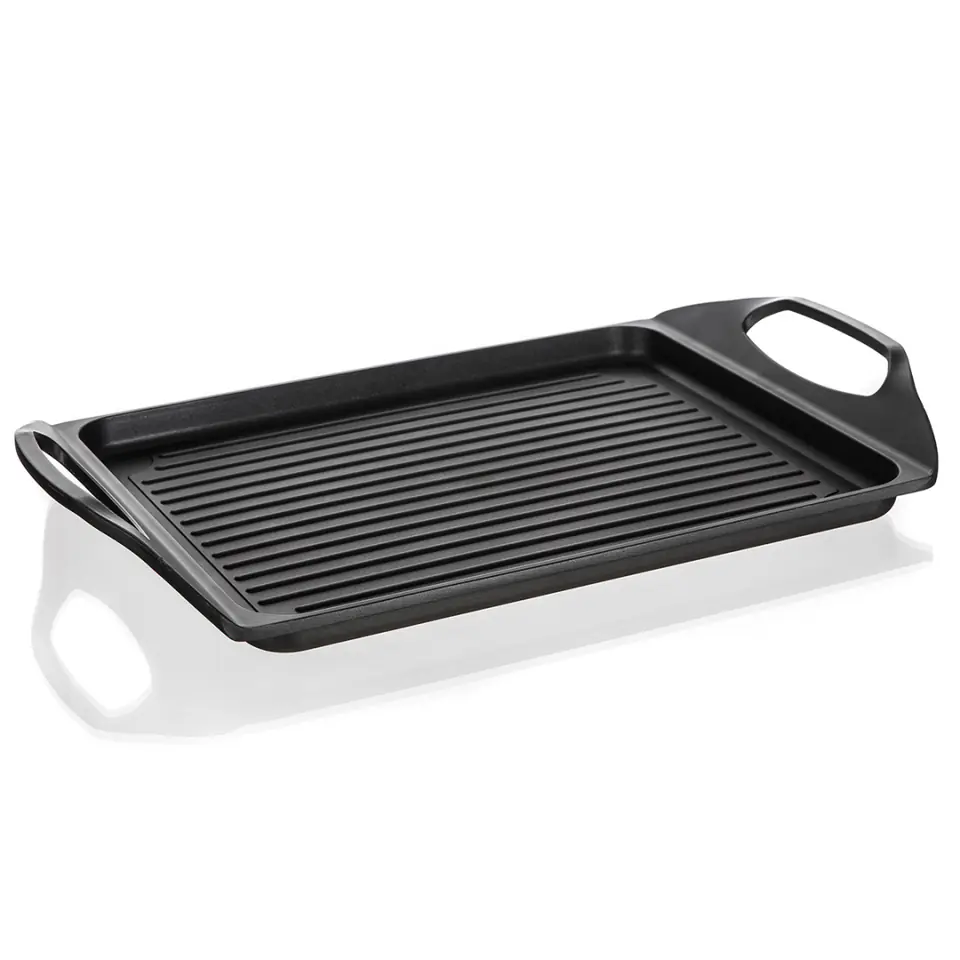 Płyta do grillowania 45 × 27 × 2,3 cm z 2-warstwową powłoką antyadhezyjną jest odpowiednia do pieczenia i grillowania na kuchence, w piekarniku oraz na grillu zewnętrznym. Jest doskonała do przygotowania steków, ryb, kiełbasek, warzyw, jajek sadzonych i pancakes. Płyta jest dostarczana z praktycznymi uchwytami ułatwiającymi obsługę. W razie wykorzystania płyty na kuchence gazowej trzeba zastosować rozpraszacze płomienia.