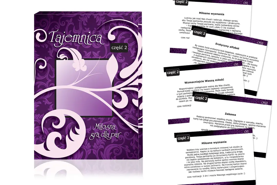 Gra towarzyska dla par - Tajemnica - część II Liczba graczy: dowolna Wiek graczy: 18+ Poziom pikanterii: 2/5 Cel gry: budowanie relacji partnerów bez tematów tabu, odnajdywanie chwil tylko dla siebie przy bardzo szybkim tempie życia, spełnianie swoich marzeń oraz pragnień nie tylko miłosnych, nauka rozmowy o potrzebach oraz uczuciach, zatrzymanie czasu w codziennej gonitwie i skupienie na wzajemnych relacjach oraz potrzebach. Chcecie pogłębić swoją wiedzę na temat budowania silnego związku uczuciowego? Jesteście otwarci na sprawy miłosne i nowe wyzwania? Dzięki tej grze rozwiniecie i umocnicie wzajemną miłość, a Wasz związek wzbogaci się o nowe doświadczenia! Gra zawiera karty, na których znajdują się opisy małych i większych przyjemności oraz miłosnych niespodzianek i gestów, które w tajemnicy będziecie wykonywać dla siebie nawzajem. Wyobraź sobie, że przez tydzień w zupełnie niespodziewanych momentach znajdujesz kwiatka z wyznaniem miłosnym od partnera lub przez jakiś czas czyta Ci on wieczorem do poduszki twoją ulubioną książkę. W tej grze nie ma przegranych! Oboje zyskujecie radość z dobrej zabawy i przyjemność z obdarowywania się miłosnymi gestami.Dlaczego warto kupować oryginalne gry Grajmy Razem? - Kilkanaście własnych sesji fotograficznych z pełnymi prawami autorskimi (wiele gier na rynku posiada kradzione obrazki z Internetu) - Najlepsi graficy oraz copywriterzy / gustowne opakowania - Gwarancja dobrego smaku i wysokiej jakości zadań oraz opisów - Bardzo staranne przygotowanie rozgrywki (opracowanie jednej gry zajmuje nawet 12 miesięcy!) - Własna drukarnia wykonująca produkcje w najwyższym dostępnym standardzie - Produkty z „każdej półki cenowej” – bardzo kompaktowa oferta - możliwość kontynuowania zabawy z innymi tytułami- Dodatkowe E-booki oraz szkolenia o bardzo wysokiej jakości do ściągnięcia ze strony Gadżet w skrócie: - gra miłosna dla par - pozwala na skupienie się na partnerze, nawet pomimo tempa dnia codziennego - wspaniale pogłębia sferę uczuć i kontaktów między partnerami - super zadania, które sprawią, że każdy dzień będzie niezwykły - kolorowe karty z zadaniami - wersja karciana bardzo wygodna do przenoszenia ze sobą - wspaniały pomysł na prezent