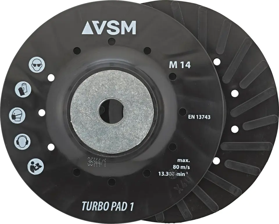 Wykonanie: w całości z gumy, z żebrami chłodzącymi. Z gwintem M14. Zastosowanie: do stosowania na średnio- i szybkoobrotowych szlifierkach kątowych przy dużych obciążeniach. Wachlarzowate żebra usztywniają talerz szlifierski i w połączeniu z dodatkowymi otworami zapewniają cyrkulację powietrza, która podczas szlifowania zmniejsza powstające ciepło. Dzięki chłodnemu szlifowi przedłuża się żywotność tarcz ściernych fibrowych.