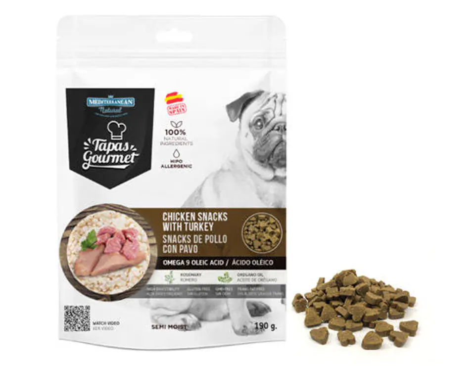mięso 73% (36% mięso z kurczaka, 20% szynka serrano, 12% mięso z indyka, 5% mięso wołowe), ryż, gliceryna roślinna, drożdże piwne.
