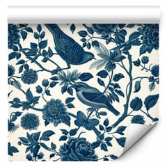 Tapeta - Ptaki i róże - monochromatyczny niebieski wzór z botanicznym motywem rozmiar 49x1000, wykończenie Samoprzylepna