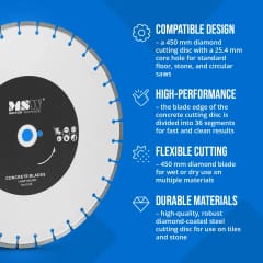 - - Diamentowa tarcza tnąca o średnicy 450 mm do pracy na mokro i na sucho oraz do cięcia szerokiej gamy materiałów,
