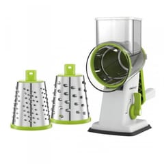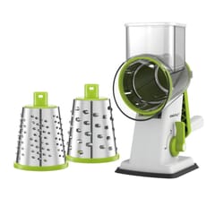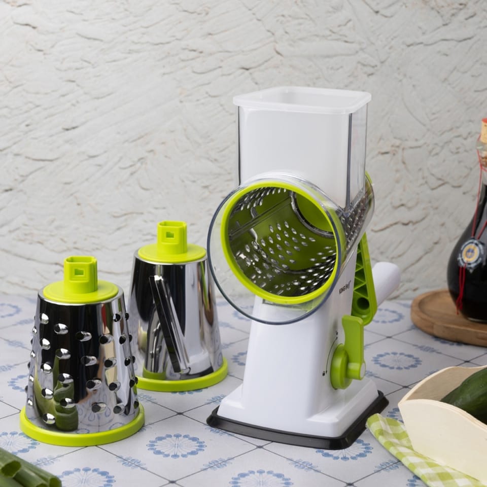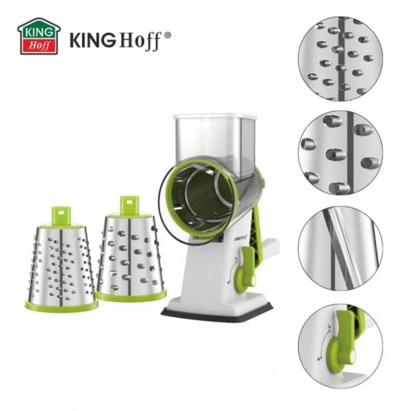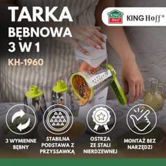 Uniwersalna tarka bębnowa 3 w 1 KINGHoff w świeżym, zielonym kolorze to praktyczny pomocnik, który ułatwi codzienne przygotowywanie posiłków. Wyposażona w trzy wymienne bębny ze stali nierdzewnej 420, pozwala z łatwością ścierać, kroić i szatkować warzywa, sery, orzechy czy owoce. Idealna zarówno dla domowych kucharzy, jak i profesjonalnych pasjonatów gotowania.