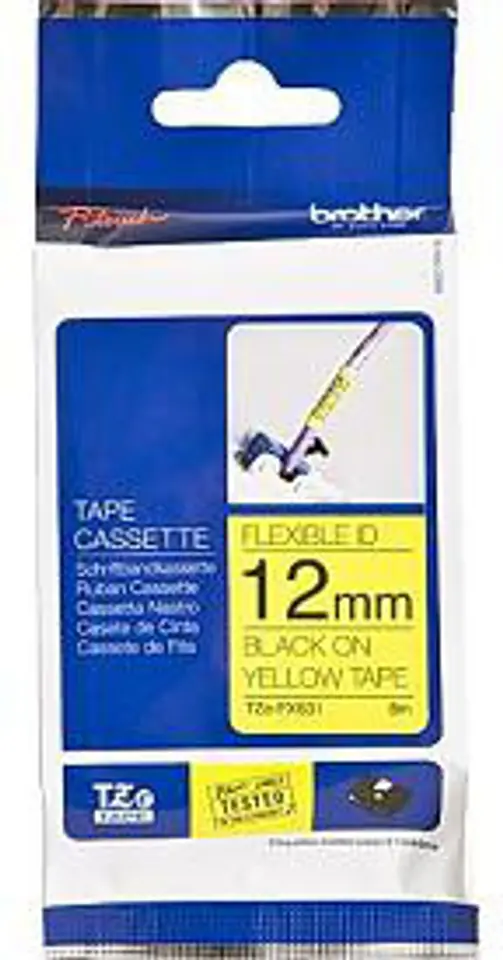 Waga i rozmiary:Długość taśmy - 8Opis ogólny:kolor - Black on YellowTyp taśmy - TZePozostałe właściwości:Rozmiar taśmy - 1.2:Producer product name - TZe-FX631 Flexible ID Laminated TapeTechnical details:Producer - Brother