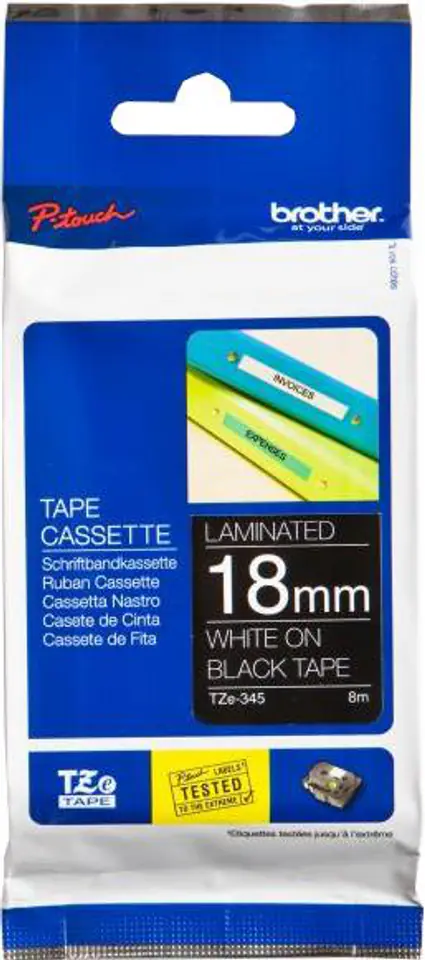 Brother TZE345 18MM WHITE ON BLACK TAPE - MOQ 25 Laminated tape 18mm, White on black, TZe, Thermal Transfer, Brother, PT-2100VP, PT-7600,
