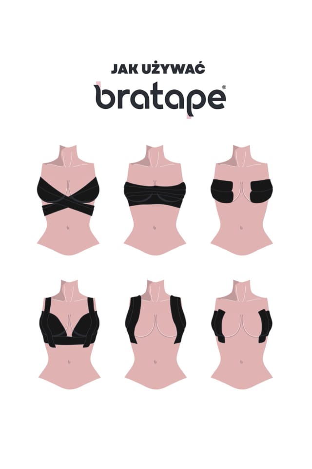 Bra tape pomaga w modelowaniu i podtrzymywaniu biustu, podkreślając naturalne kształty i kontury. Taśma do podklejania biustu świetnie sprawdza się do noszenia pod ubraniami bez ramiączek lub z głębokim dekoltem, przy których piersi wymagają dodatkowego wsparcia, ale krój ubrania nie pozwala na noszenie tradycyjnego biustonosza. Przy użyciu taśmy do oklejania poleca się osłonić sutki specjalnymi nakładkami tzw. osłonkami na brodawki, które ochronią najbardziej wrażliwe miejsca.