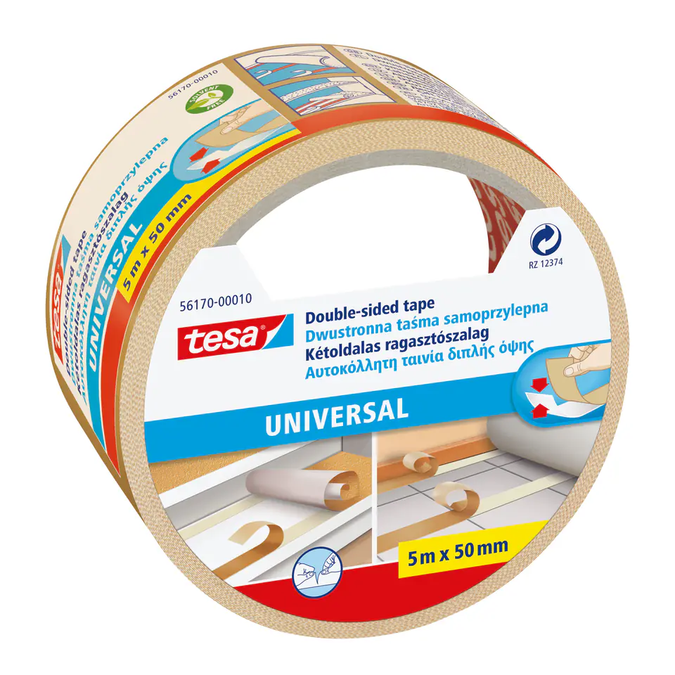 Uniwersalna taśma dwustronna z białej folii PP i z silnie klejącym klejem z kauczuku syntetycznego (Hot Melt)._Szeroki zakres zastosowań: dwustronne łączenie folii, plastiku, włókna czy kartonu, mocowanie wykładzin i elementów dekoracyjnych.
