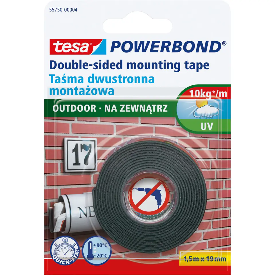 - Niezawodna, odporna na działanie czynników atmosferycznych, samoprzylepna taśma dwustronna montażowa przeznaczona do szerokiej gamy zastosowań na zewnątrz pomieszczeń