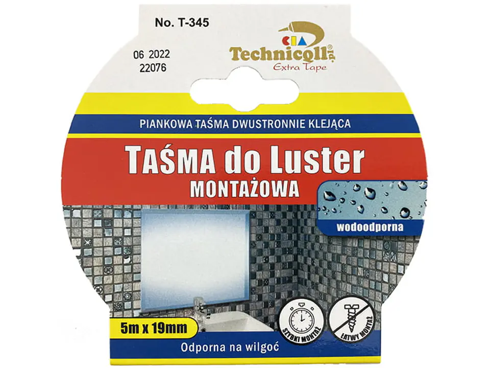 Mocna, łatwa w użyciu taśma dwustronna, przeznaczona do szybkiego montażu luster i innych płaskich przedmiotów. Idealna do stosowania w łazienkach. Przylega do większości gładkich i twardych powierzchni tj. glazura, metal, tworzywa sztuczne, szkło, drewno, powierzchnie lakierowane.
