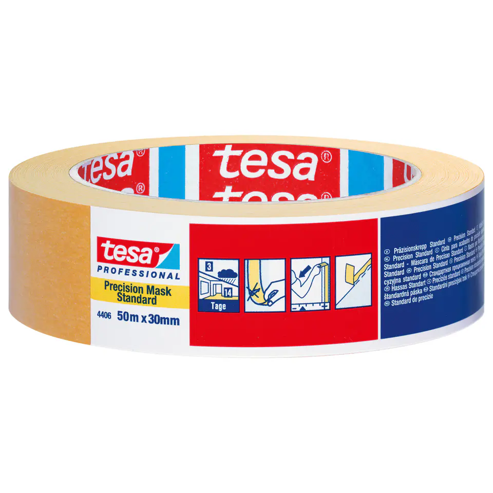 - Lekko krepowana taśma maskująca do zastosowań malarskich wewnątrz pomieszczeń