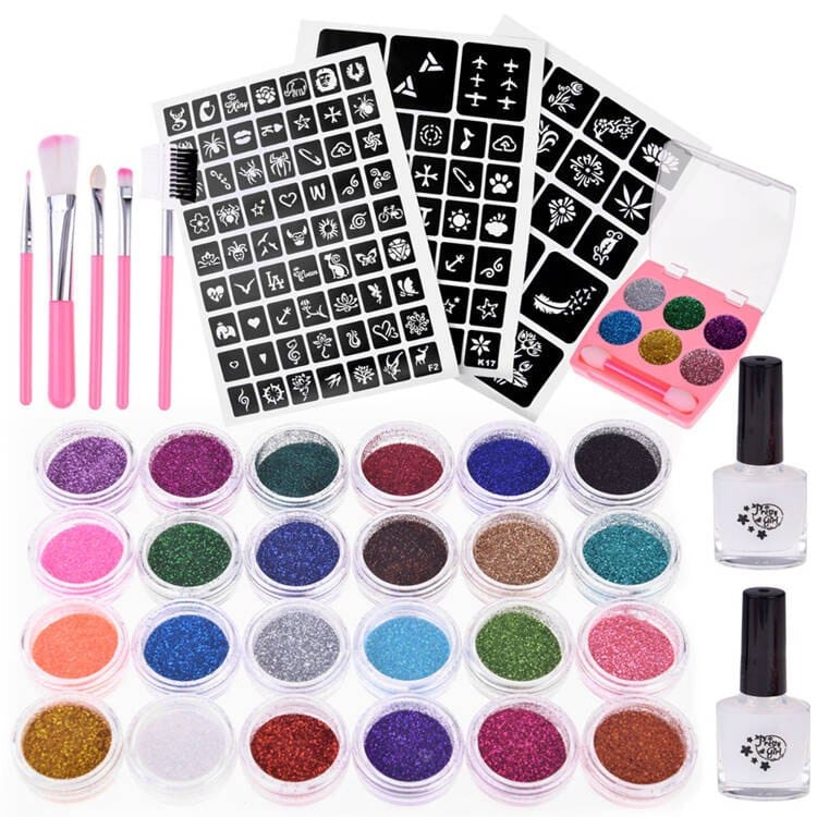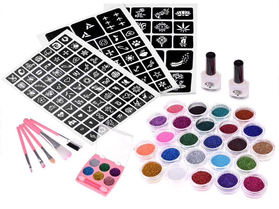 Duży kreatywny zestaw tatuaży dla dzieci pozwoli na stworzenie imprezowego look'u, dzięki niemu można pięknie ozdobić ciało kolorowymi, pięknie iskrzącymi się tatuażami brokatowymi. Świetnie sprawdzi się jako prezent lub atrakcja np. na kinderbalach, festynach, urodzinach czy balach andrzejkowych, karnawałowych. Kolorowe tatuaże dają mnóstwo frajdy i są miłą pamiątką po wesołej zabawie.