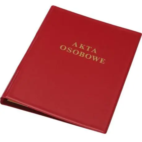 Teczka do akt osobowych. Mocna tektura oblewana folią PVC z elastycznie formowanym grzbietem. Wyposazona w kieszonke na grzbiecie, 4 sztuki wewnetrznych listew z zapieciami skoroszytowymi, 3 sztuki przekladek personalnych (wg. wzoru kodeksu pracy). Konstrukcja teczki umozliwia pionową archiwizacje pólkową.