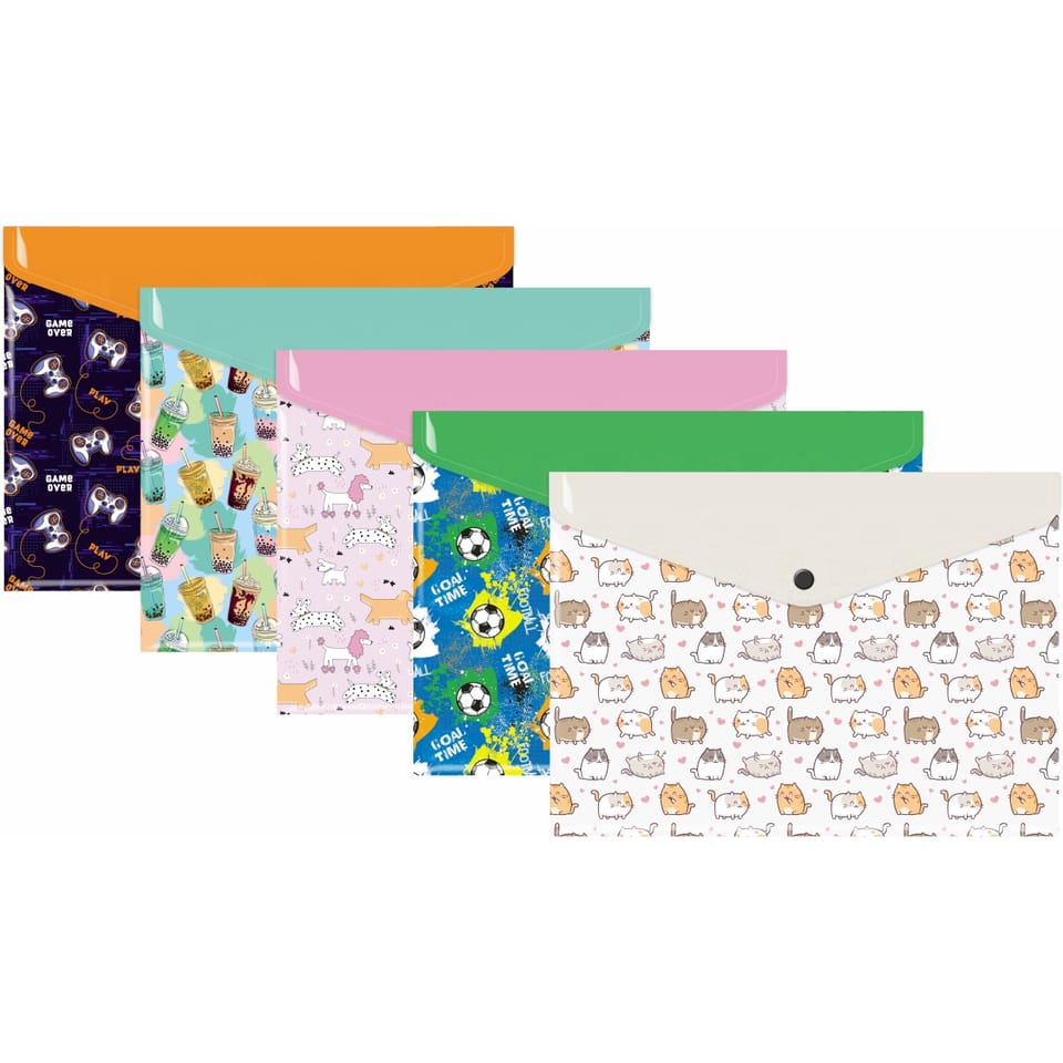 Teczka koperta A4 PP nadruk- wykonana z folii PP z pełnym, ozdobnym nadrukiem na całej powierzchni oraz klapą w kontrastowym kolorze