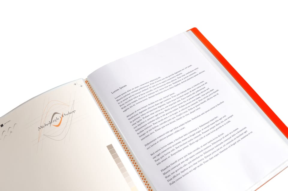 - Posiada grzbiet i kieszeń opisową na przedniej okładce, format A4.