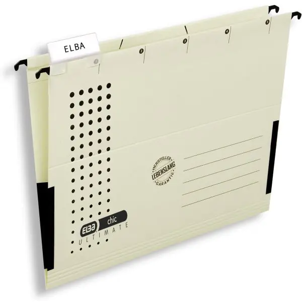 Teczki zawieszkowe w formacie A4, wykonane z mocnego kartonu. U góry znajduje sie przesuwny szyldzik z wymienną etykietą opisową.