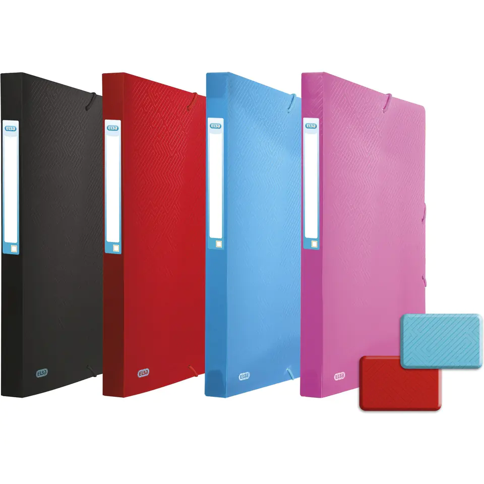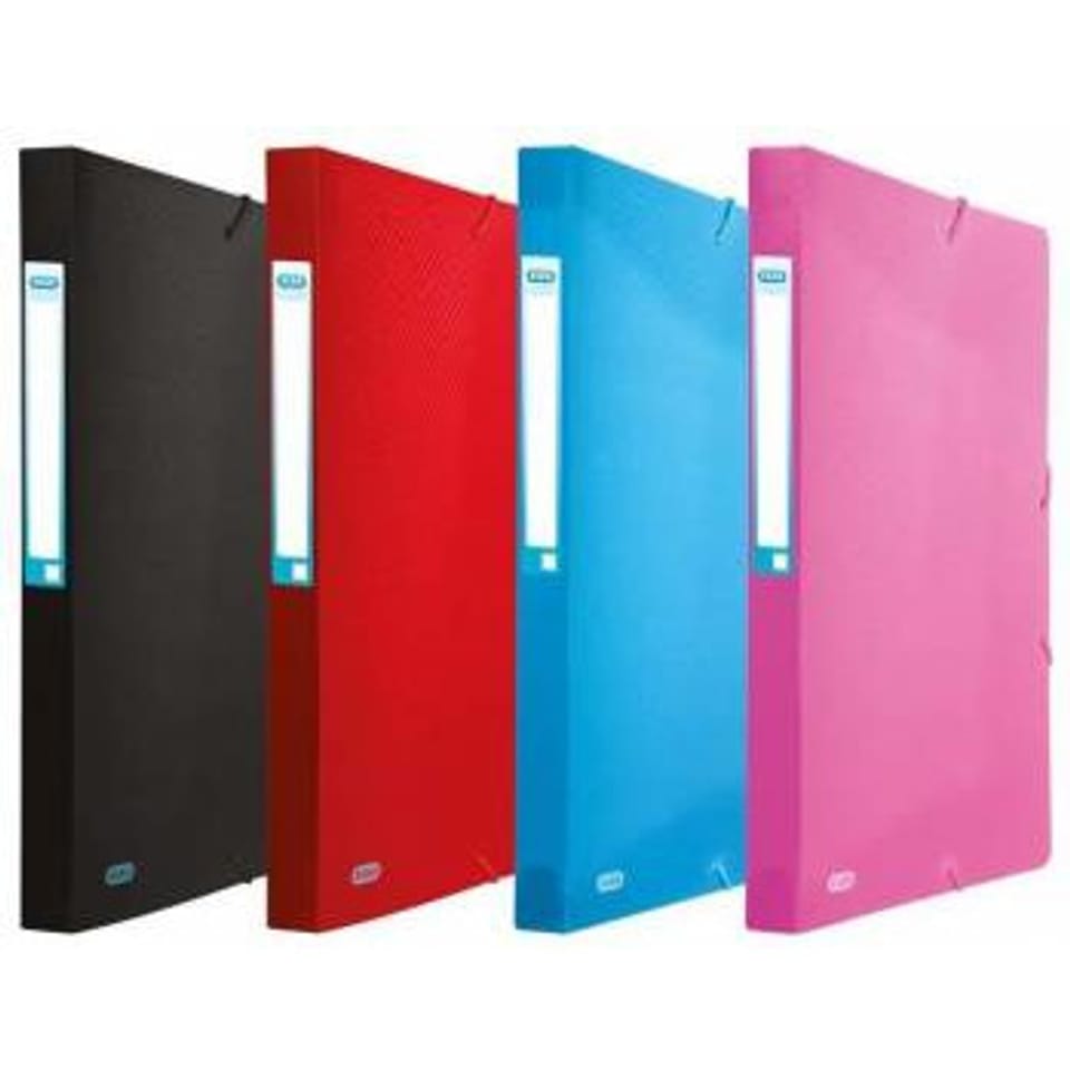 * jednostka sprzedaży: 1 szt. * wykonana z polipropylenu o grubości 650 mic. * PP nieprzezroczysty: czarna, czerwona * PP przezroczysty: niebieska, różowa * etykieta opisowa na grzbiecie * zamykana na gumki w kolorze teczki * format A4+ * wymiary: 24 x 32 cm * szerokość grzbietu: 40 mm