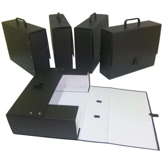 Teczka z rączką „MAXI” wykonana ze sztywnej tektury oklejonej z dwóch stron elegancką okleiną. Szerokość grzbietu 10 cm. Rączka i zamek wykonane z czarnego plastiku.