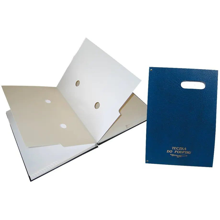 Teczka do podpisu z okienkiem Warta - okladka twarda oklejana. Grzbiet harmonijka. Lączenie okladki z blokiem wzmocnione nitami. Na przedniej okladce okienko z szybką, pod którą mozna umieszczac napisy. - blok z kartonu barwionego w masie zawiera 20 kart z 2 otworami i wycietymi registrami - jednostka sprzedazy 1 sztuka