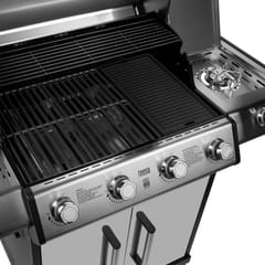 Ogólne----------Łączna moc – główne palinki: 14 kWMoc – boczny palnik: 3 kWTyp gazu: butan / propan / LPGKategoria: I3 B/P(37) Ciśnienie: 37 mBarZużycie gazu – główne palniki: 1019 g/hZużycie gazu – boczny palnik: 218 g/hŚrednica otworu dyszy – główne palniki: 0,86 mmŚrednica otworu dyszy – boczny palnik: 0,80 mm----------Cechy----------Palnik: 4 główne + 1 bocznyRuszt: 1Wymiary rusztu: 23 x 45 cmPłytaPowierzchnia grilowania: 71,5 x 45 cmPółka boczna: 2Wymiary bocznej półki: 33 x 51 cmRuszt do podgrzewaniaWymiary rusztu do podgrzewania: 66,8 x 15,3 cmOsłony palników: 4Zapalnik: automatycznyTermometr w pokrywieTaca na wytapiający się tłuszczPojemnik na wytapiający się tłuszczSzafka2x 2,5-calowe kółka, 2x kółka skrętne4 haczyki----------Materiał wykonania----------Pokrywa / panel / drzwi: stal nierdzewnaBoczne półki: stal nierdzewnaPanel dekoracyjny bocznej półki: stal nierdzewnaPalniki: stal nierdzewnaRuszt do podgrzewania: żelazo emaliowane porcelanąRuszt/płyta: żeliwo emaliowane porcelanąOsłony palników: stal nierdzewnaRączka: stal nierdzewna----------Parametry fizyczne----------Wymiary produktu: 140 x 56,5 x 117,5 cmWaga netto: 45,5 kg----------W zestawie----------GrillInstrukcja obsługiInstrukcja montażu----------Parametry środowiskowe----------Do użytku wyłącznie na zewnątrz>1 m od innych obiektówKompatybilność butli gazowejWaga: 4,5 – 11 kg (butan) / 3,9 – 11 kg (propan)