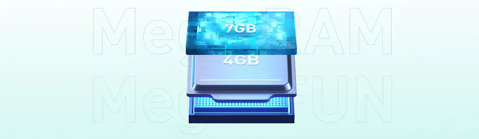 Integracja pamięci RAM i ROM zwiększa moc do efektywnych 7 GB rozszerzonej pamięci RAM. Taka kombinacja znacznie zwiększa szybkość i wydajność smartfona, oferując od 3 do 9 dodatkowych aplikacji działających w pamięci podręcznej w tle oraz od 10 do 50% szybszy średni start najczęściej używanych aplikacji.